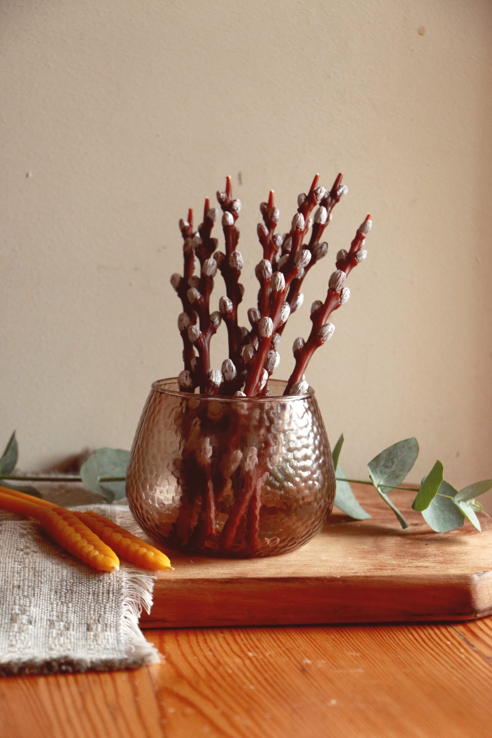 Поєднання Свічка вербова гілочка легка, вертикальна й “повітряна”. Вона додає композиції весняної ніжності. Саме тому її краще поєднувати з більш об’ємними формами, тоді декор виглядає гармонійно. Враховуйте що Гілочка горить до 35 хв, приблизно.