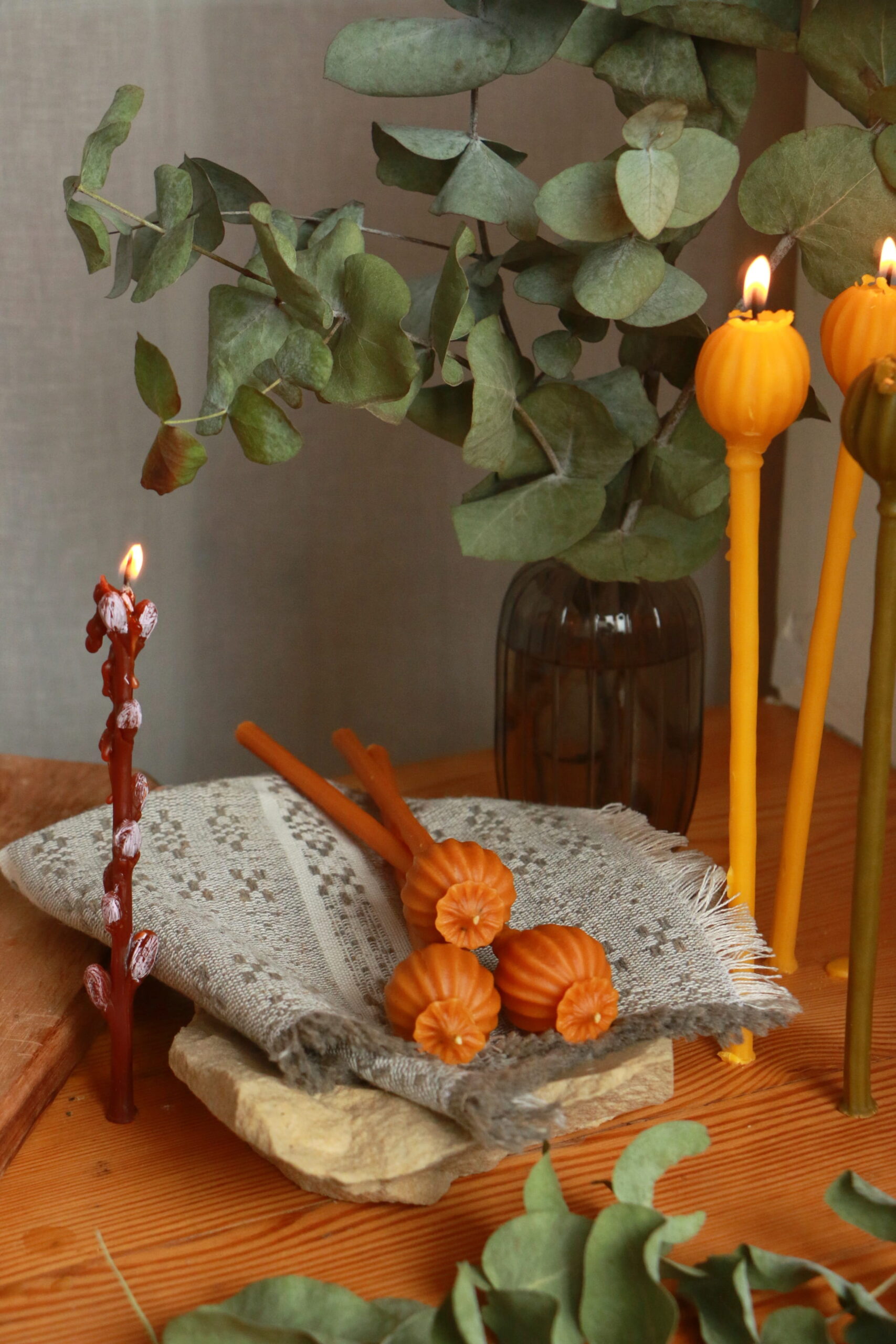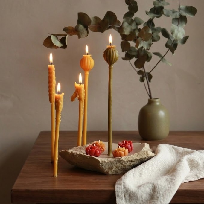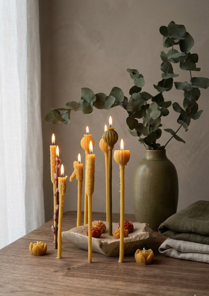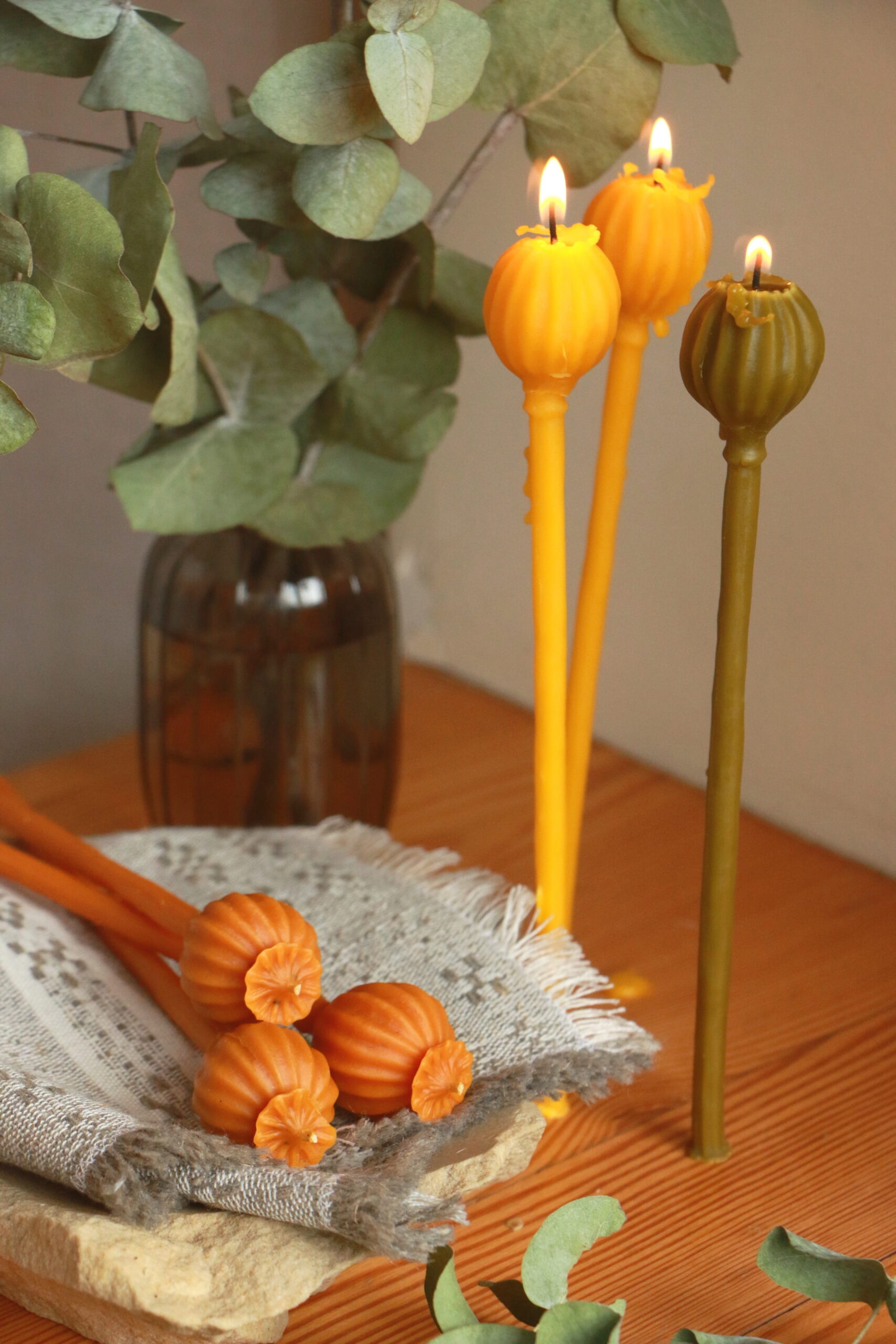 Свічка Маківка з довгим стеблом створена з натурального фермерського бджолиного воску, що зберігає природну енергію та наповнює простір ніжним медовим ароматом.